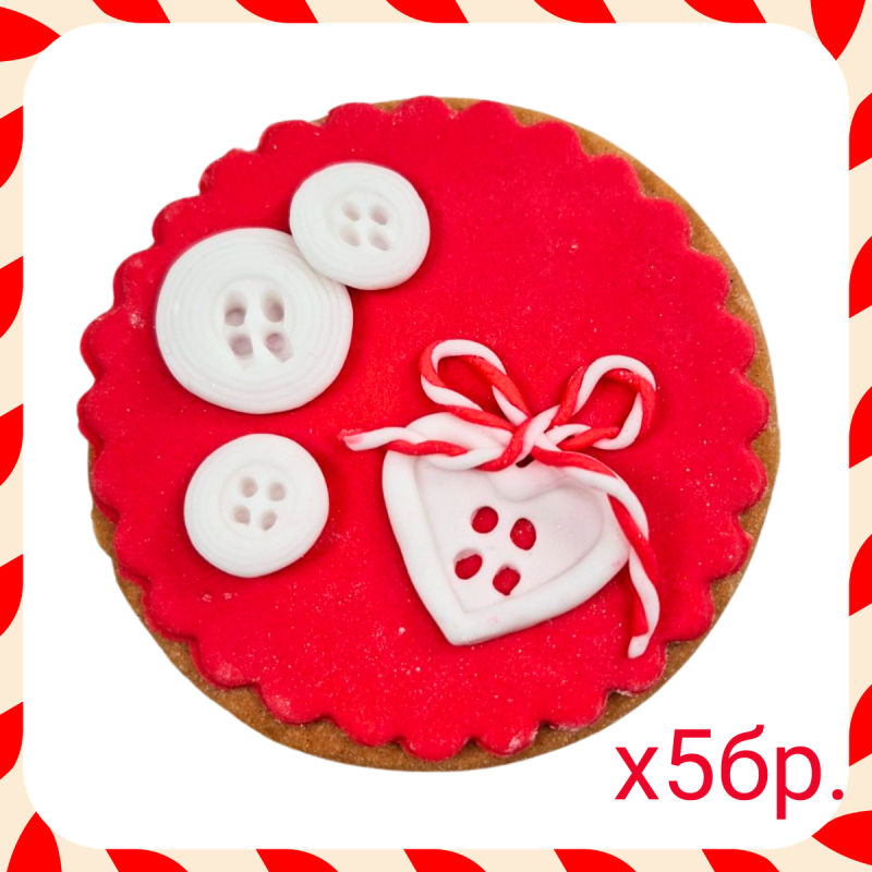 5 броя бисквитки с краве масло и фонданова декорация. Диаметър 7,5 см. Всяка бисквитка се опакова индивидуално в целофаново пликче.