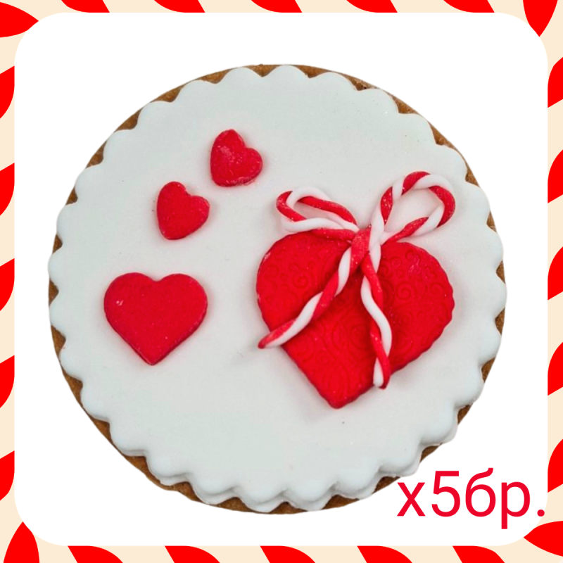5 броя бисквитки с краве масло и фонданова декорация. Диаметър 7,5 см. Всяка бисквитка се опакова индивидуално в целофаново пликче.