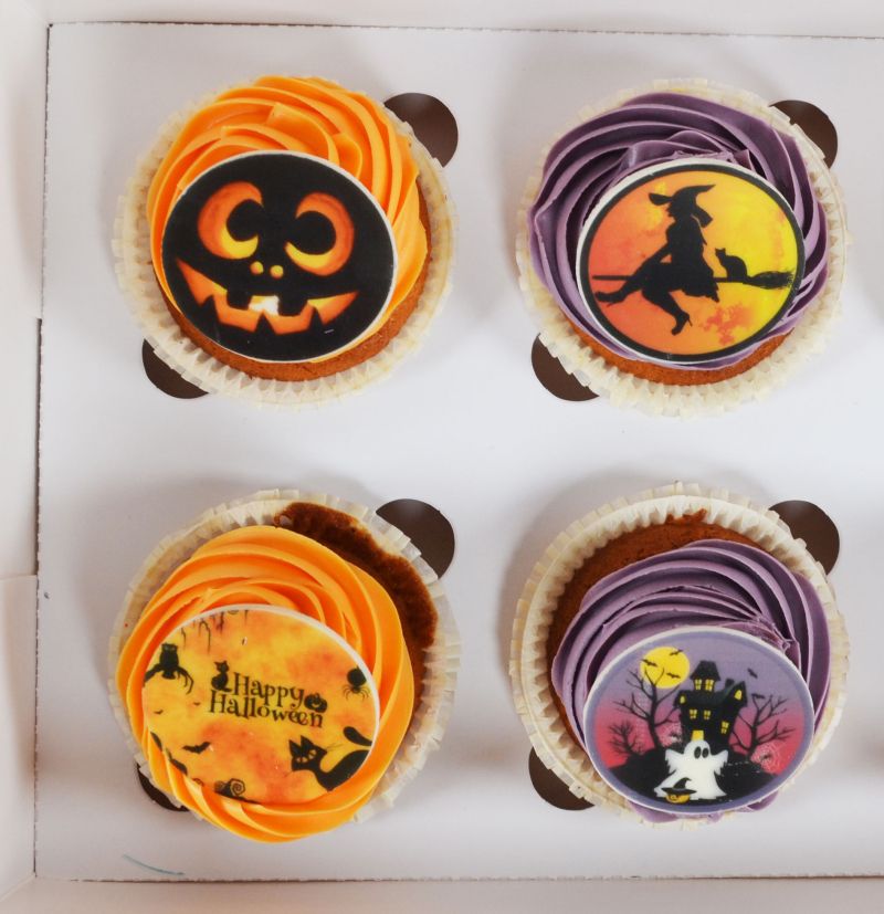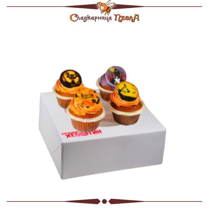 Беля или лакомство? Спасете се от белите с този сет от четири броя тематични хелоуински ванилови къпкейка в кутия. Размер на кутията 20/20/8 см.