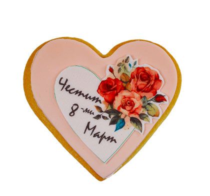 Едно специално предложение за празника на жената 8 март . Хрупкава бисквитка, покрита със захарна декорация. Всяка бисквитка е с диаметър 8-10см. и грамаж не по-малко от 60гр.